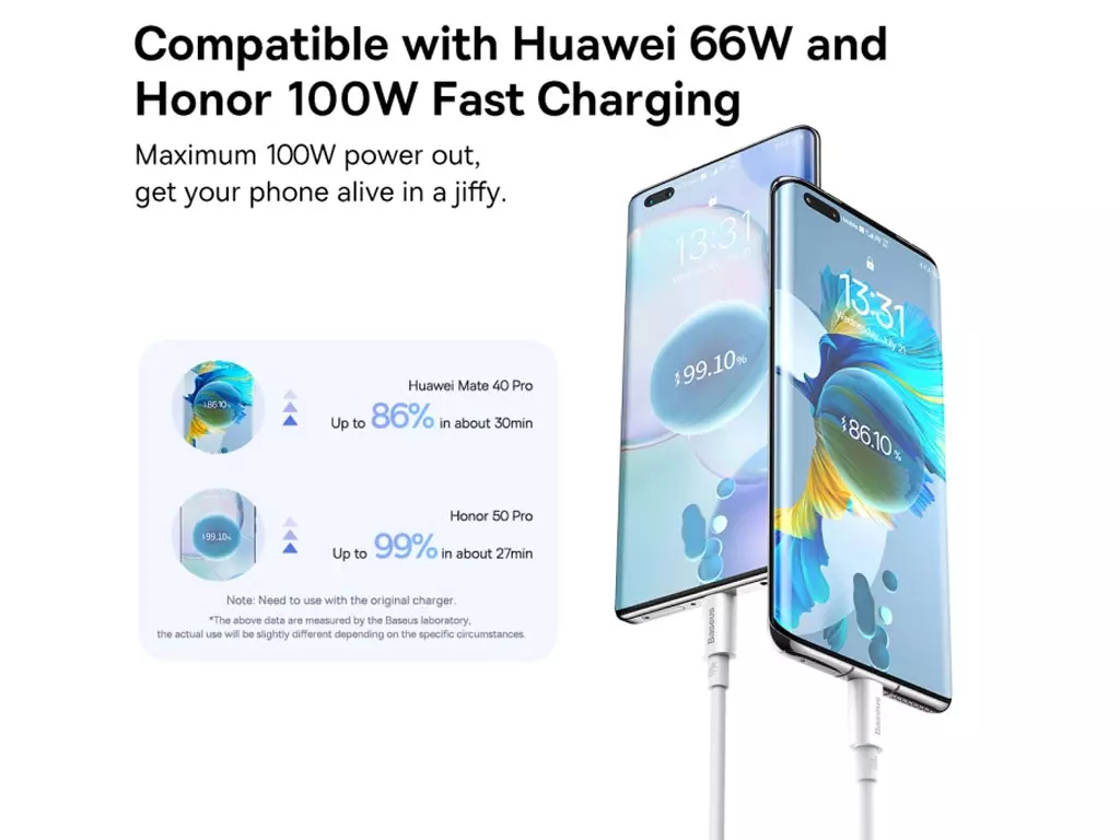 با بزرگتر شدن صفحه نمایش گوشیهای موبایل و افزایش مصرف باتری دغدغه تمام شدن باتری آنها هم به زندگی روزمه افراد افزوده شده؛ اما کابل شارژ تایپسی برند بیسوس مدل P10320102114-02 با استفاده از هسته متشکل از 6 کابل قطور با قدرت تحمل شدت جریان خروجی 6A و توان 100W توانسته رتبهای عالی بین دیگر کابلهای شارژ را کسب کند. با کمک این شارژر گوشی Honor 50 Pro تنها در 27 دقیقه فول شارژ میشود و در 30 دقیقه، شارژ باتری Huawei Mate 40 Pro به 86٪ میرسد.