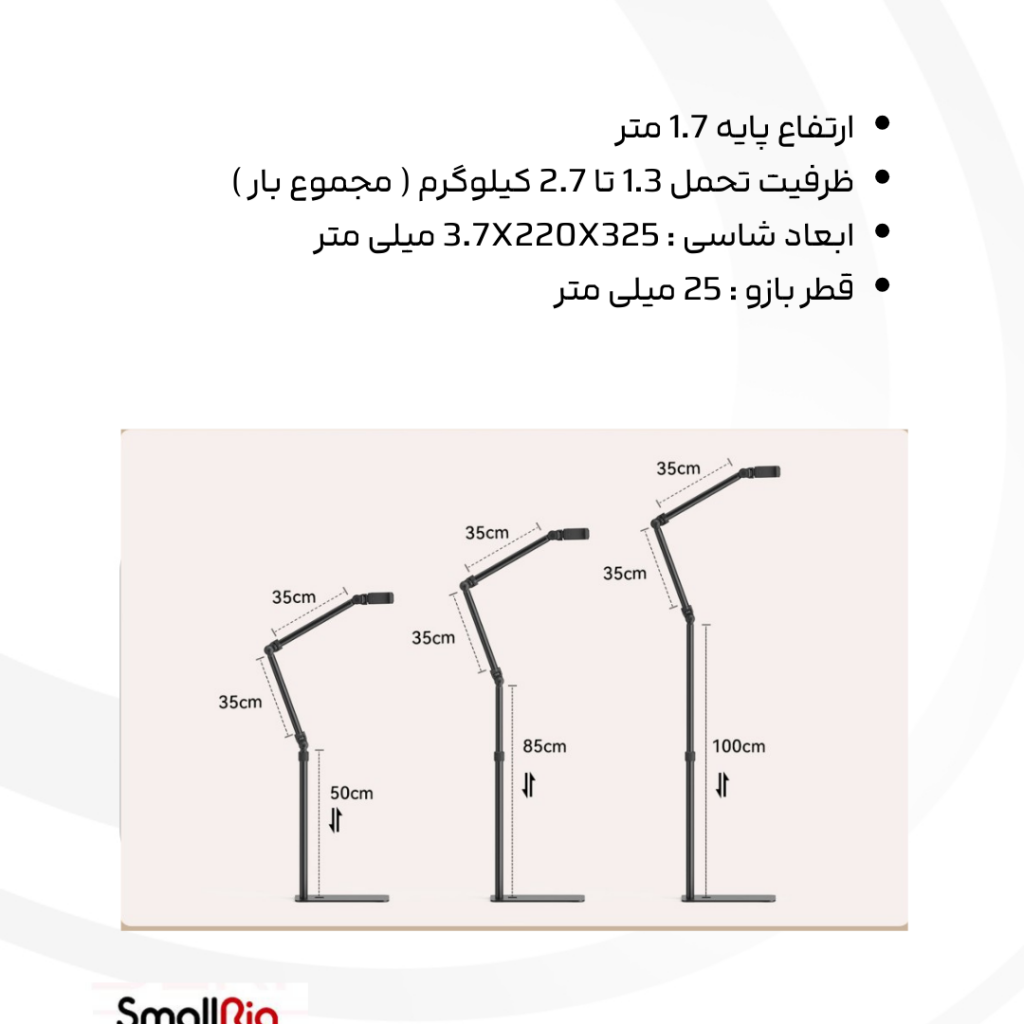 طراحی قابل تنظیم برای عکاسی از بالا: این پایه با ارتفاع ۱.۷ متر، ارتفاع کافی برای گرفتن عکسهای از بالا را فراهم میکند و قابلیت چرخش ۳۶۰ درجهای دارد که امکان تنظیم زاویه در هر جهت را میسر میسازد.