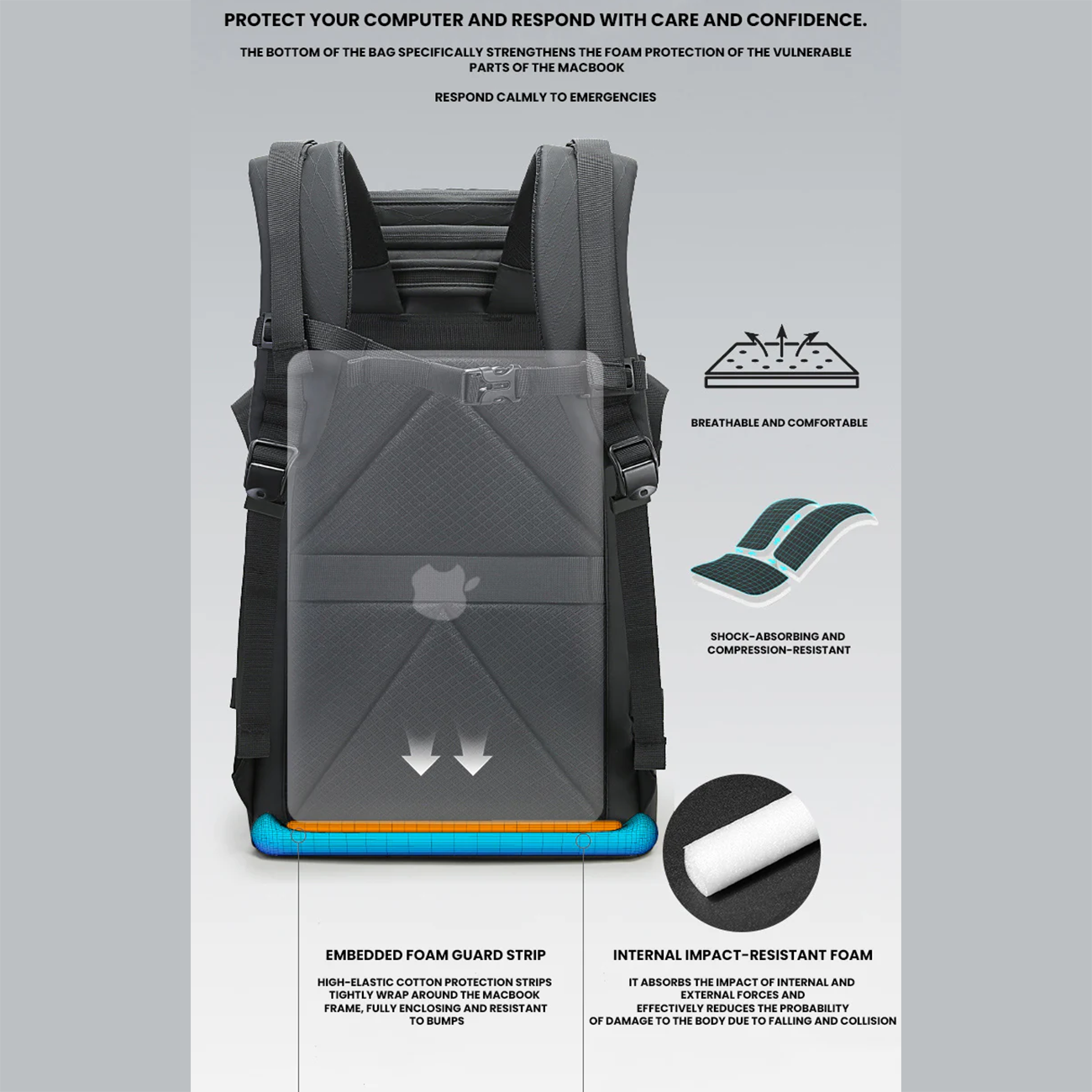کوله پشتی دانشجویی بنج مدل FW-226 دارای یک محفظه اصلی بزرگ با جیبهای داخلی مجزا است که بهخوبی از لپتاپ تا سایز 15.6 اینچ و دیگر وسایل دیجیتالی شما محافظت میکند. طراحی فوم ضربهگیر در بخش پایین، امنیت بیشتری برای دستگاههای حساس فراهم میآورد.