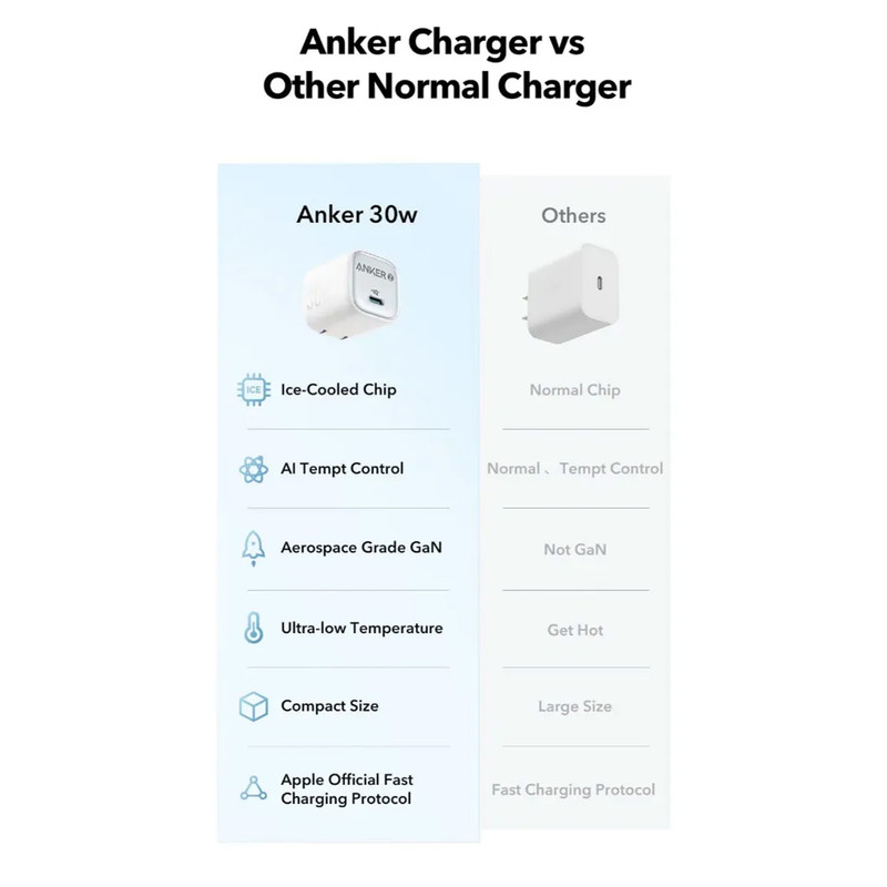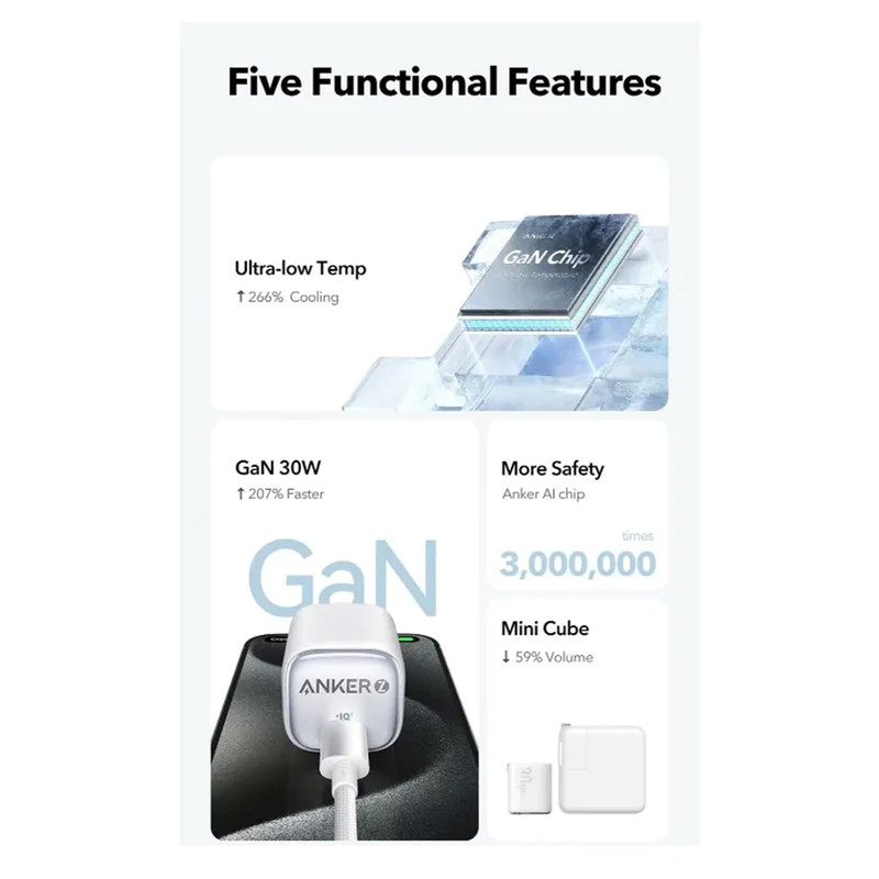 کنترل پیشرفته دما: طبق ادعای Anker، حداکثر تا ۱۳ درجه سانتیگراد خنکتر از شارژرهای معمول است
