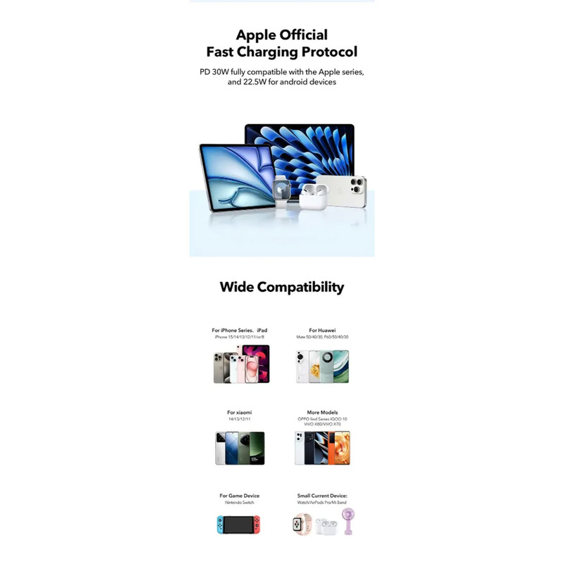 - تبلتها و گجتها: iPad Air/Pro (مدلهای نیازمند ≤۳۰ W)، AirPods، Apple Watch، دستگاههای USB‑C مانند Switch و هدستهای همراه