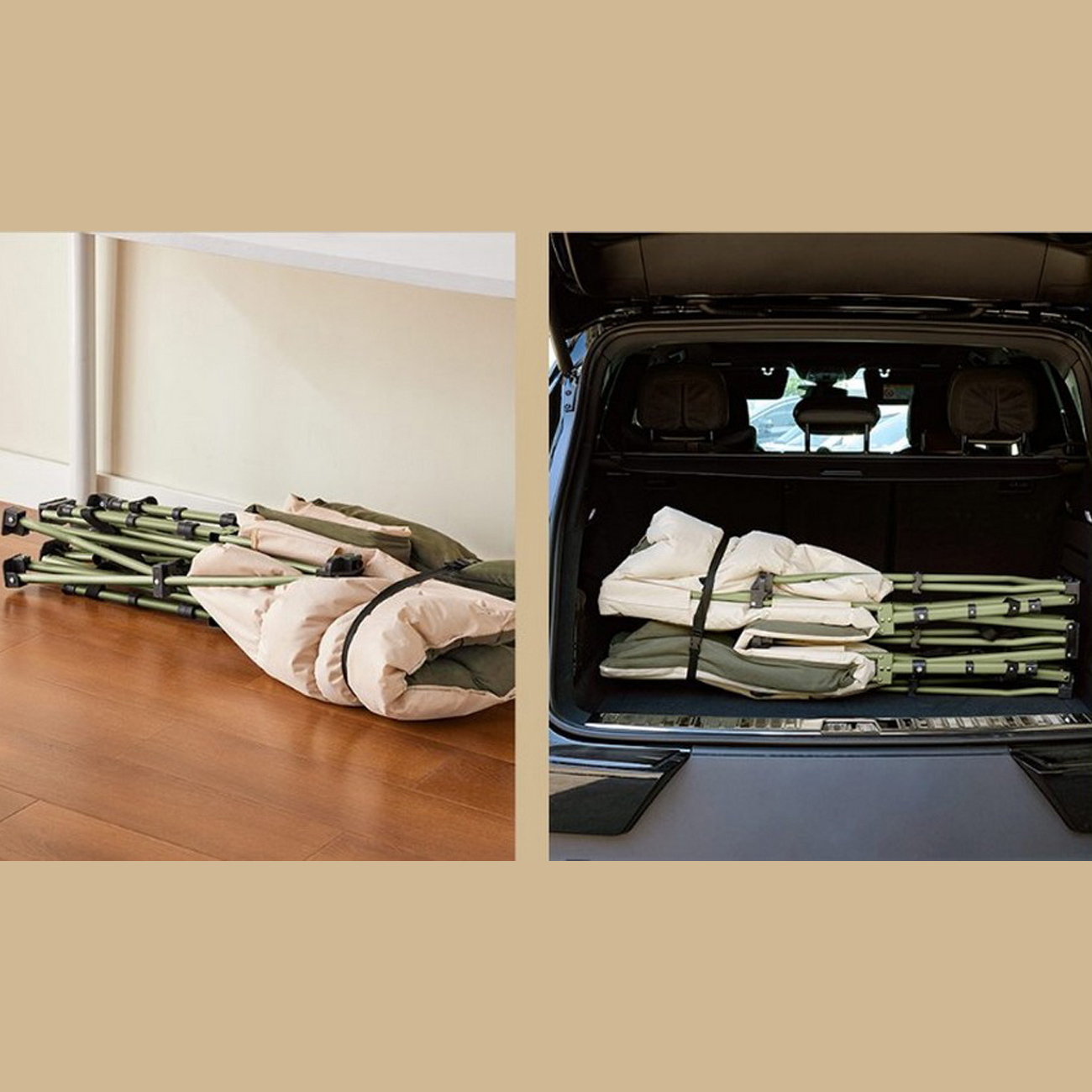 بدنهی این تخت کمپینگ شیائومی از لولههای فلزی مقاوم ساخته شده تا وزن بدن را بهخوبی تحمل کند و حتی در شرایط استفادهی طولانی یا وزنهای نزدیک به حداکثر، دچار افت پایداری نشود. با وجود این استحکام، وزن خالص محصول تنها 6.4 کیلوگرم است که امکان حمل آسان و جابهجایی سریع آن را فراهم میکند. در حالت جمعشده نیز با ابعاد 105×28×20 سانتیمتر بهقدری کمجا میشود که میتوانید آن را بدون دردسر در کمد، زیر تخت یا صندوق عقب خودرو قرار دهید.
