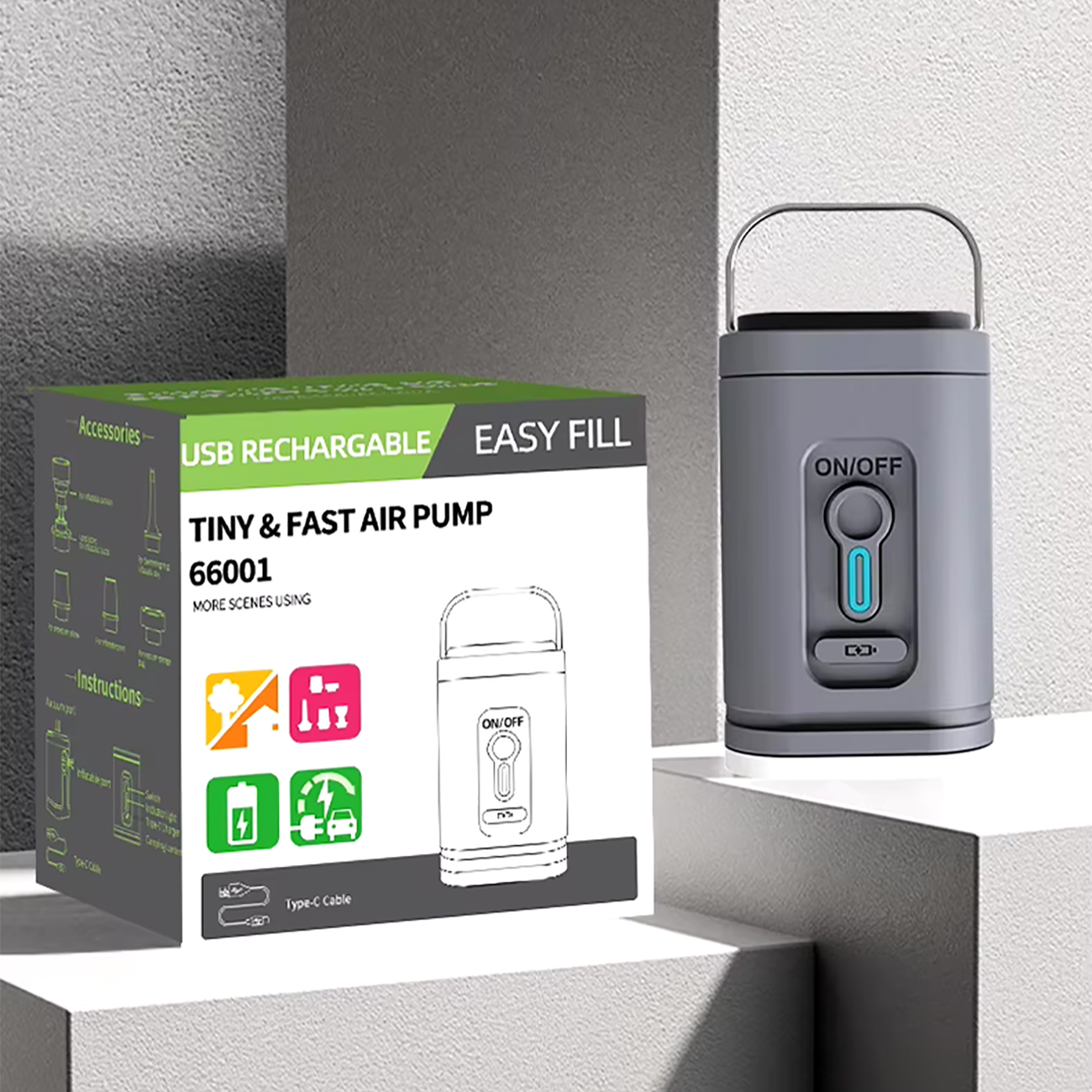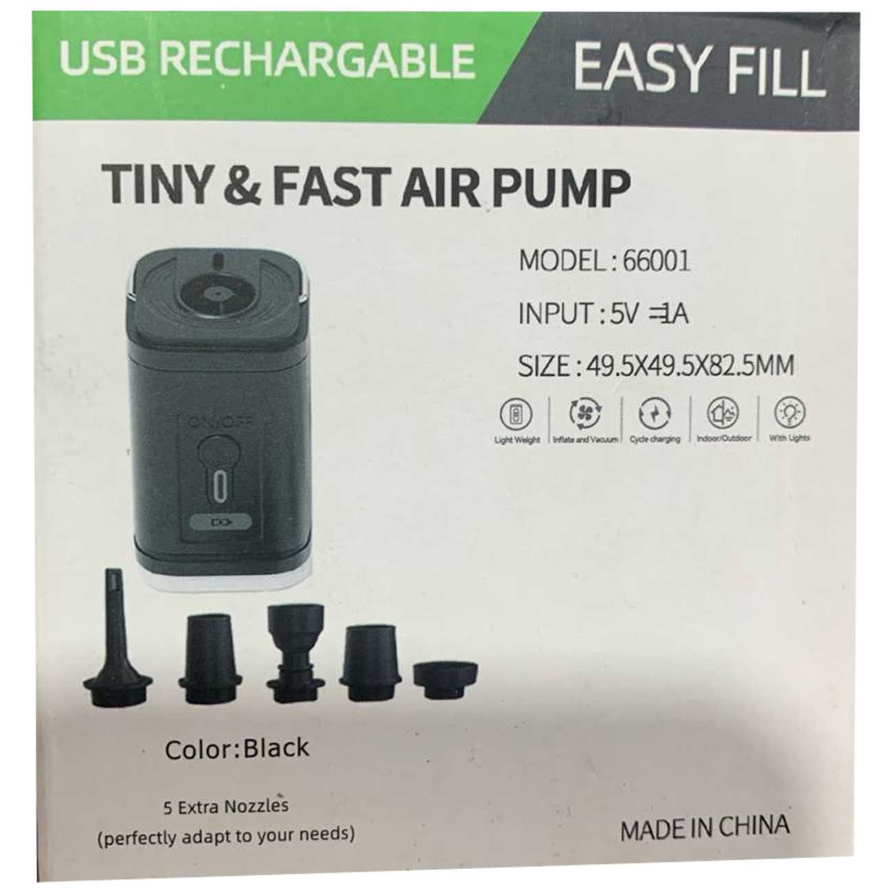 پمپ هوای کوچک EASY FILL 66001 TINY & FAST AIR PUMP با قابلیت شارژ و اندازه کوچک خود، بهترین همراه برای سفرهای شماست؛ همچنین قابل استفاده به عنوان یک چراغ کمپینگ میباشد تا شما راحتی بیشتر را تجربه نمایید. در ضمن یک مکنده هوا مخصوص کوله پشتی بنج با کد BG-3028 هم هست.