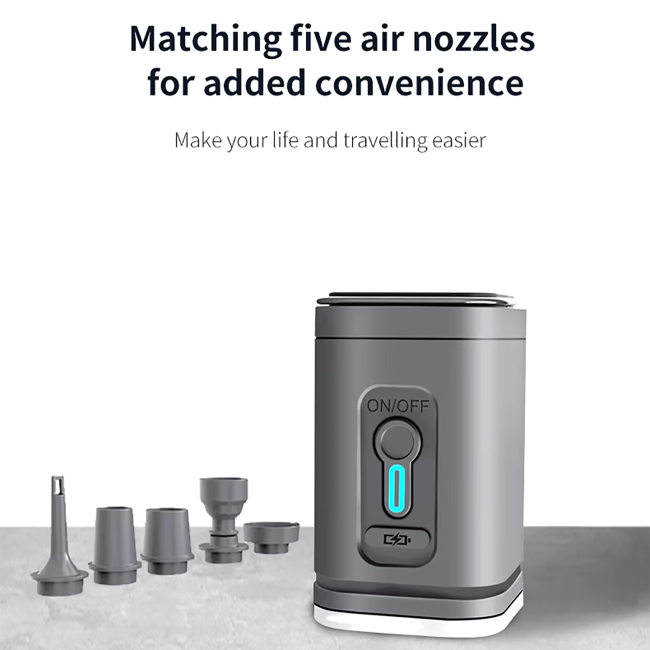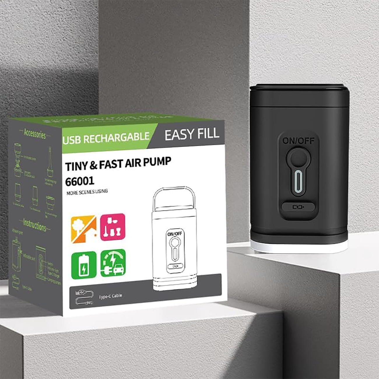 پمپ باد قابل حمل 66001 مجهز به 5 نازل هواست که میتواند برای اکثر محصولات هوای بادی سایز کوچک مناسب باشد. از آن میتوان برای باد کردن تشک بادی ، تخت بادی، قایق بادی شنا نیز استفاده کرد. همچنین مجهز به یک نوع سری مناسب برای کیسههای وکیوم برای بسته بندی کارآمدتر می باشد.