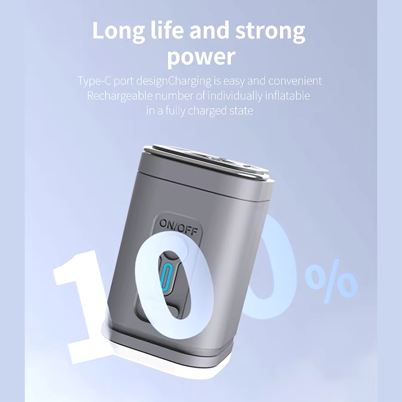 درگاه شارژ نوع C (شامل کابل usb) میتواند برای شارژ پمپ هوای فوق سبک به روشهای مختلف استفاده شود. مجهز به ظرفیت باتری 1200 میلیآمپر ساعتی با ورودی 5 ولت/ 1 آمپر است که میتواند تا 25 دقیقه پس از شارژ کامل کار کند. پمپ هوا قابل شارژ تخت بادی ، به سادگی بهترین انتخاب برای ورزش در فضای باز است.