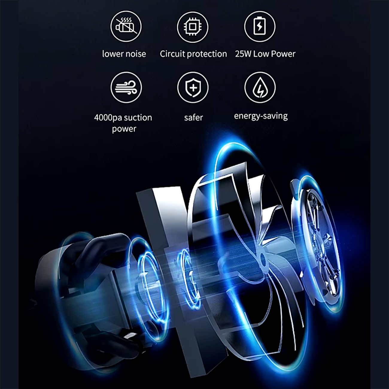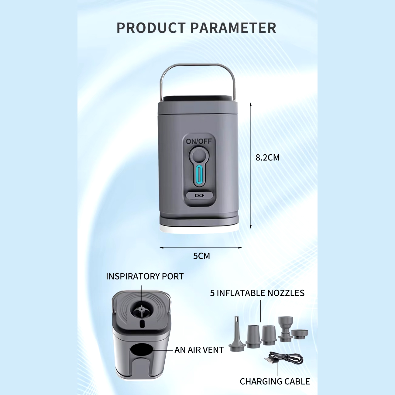 پمپ باد شارژی برای وسایل بادی دارای فشار 4000 Pa و جریان هوای بالا 200 لیتر در دقیقه است که باعث میشود سرعت باد/باز شدن بادها تضمین شود و به راحتی میتواند بالشتک هوا را در حدود 30 ثانیه پر کند. سطح نویز در هنگام باد کردن کمتر از 80dB است که هیچ مزاحمتی برای شما ایجاد نمیکند. موتور ارتقاء یافته با مصرف انرژی کم و قدرت بیشتر فوق العاده سریع و کارآمد است.