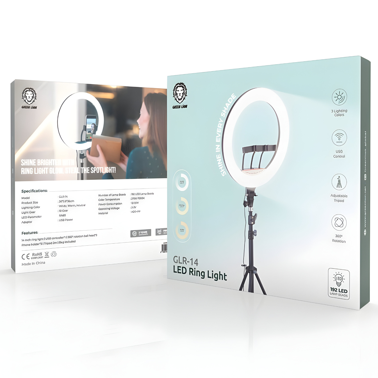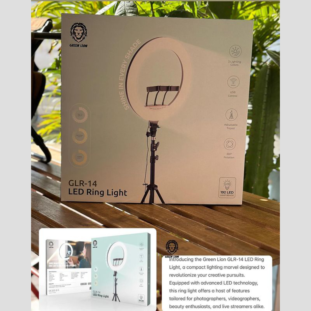 رینگ لایت گرین لاین مدل GLR-14 GNRNGLIT14 یک ابزار حرفهای برای عکاسان، فیلمبرداران و علاقهمندان به زیبایی است که به دنبال نورپردازی دقیق، روشن و واضح هستند. با داشتن حلقه نور 14 اینچی، 192 لامپ LED، تنظیم نور در 3 حالت، 3 جایگاه هولدر موبایل، قابلیت چرخش 360 درجه و سه پایه قابل تنظیم 2 متری، مناسب برای گرفتن عکسهای سلفی زیبا، عکسهای قبل و بعد از تغییرات چهره در سالنهای آرایشی، کلینیکها، میهمانیها و غیره است. با داشتن نور کافی برای تصویربرداری، این محصول تاثیر زیادی در کیفیت عکس و فیلمهای شما دارد. برای آرایشگرها و بلاگرها که مدام در فضای بسته خود در حال عکاسی یا فیلمبرداری هستند و کیفیت عکس و وضوح رنگها و جزئیات برایشان بسیار مهم است، این محصول یک ابزار ضروری است. رینگ لایت گرین لاین، تصاویر زیبا را برای شما به ارمغان میآورد.