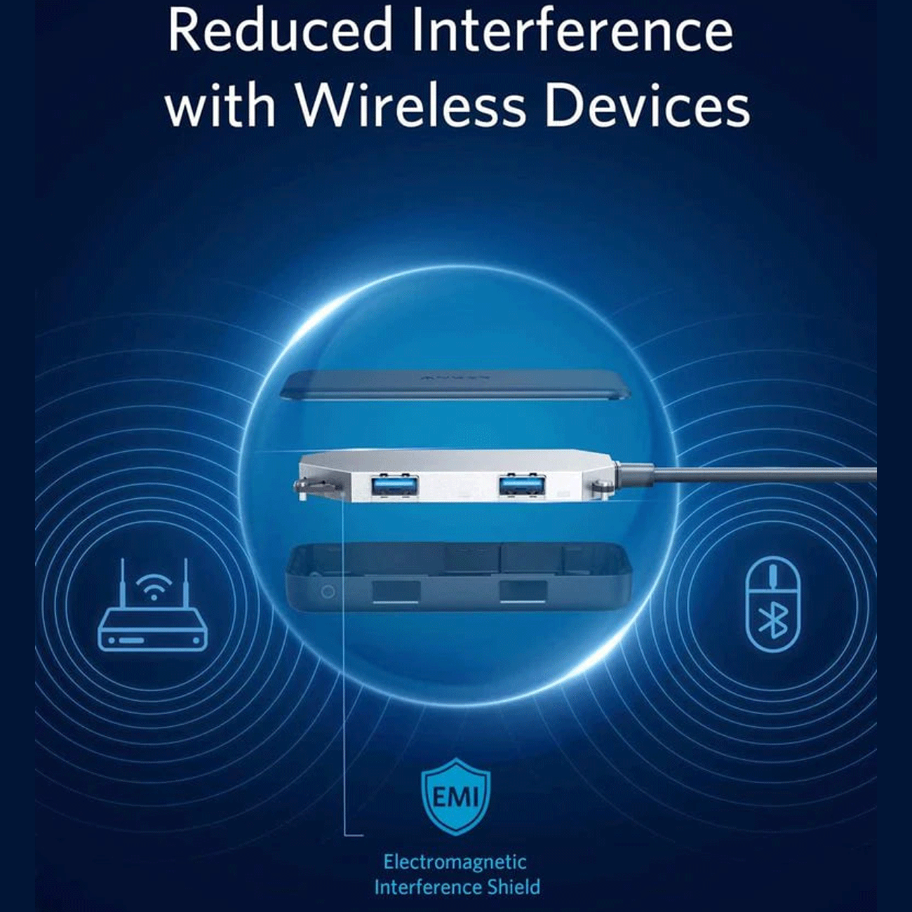 بدنه این هاب از پلاستیک مقاوم ساخته شده و طراحی داخلی آن بهگونهای است که از ایجاد نویز الکترومغناطیسی (EMI) در کنار سایر دستگاههای بیسیم جلوگیری میکند. این موضوع باعث میشود اتصال بیسیم دستگاههای دیگر دچار اختلال نشود.