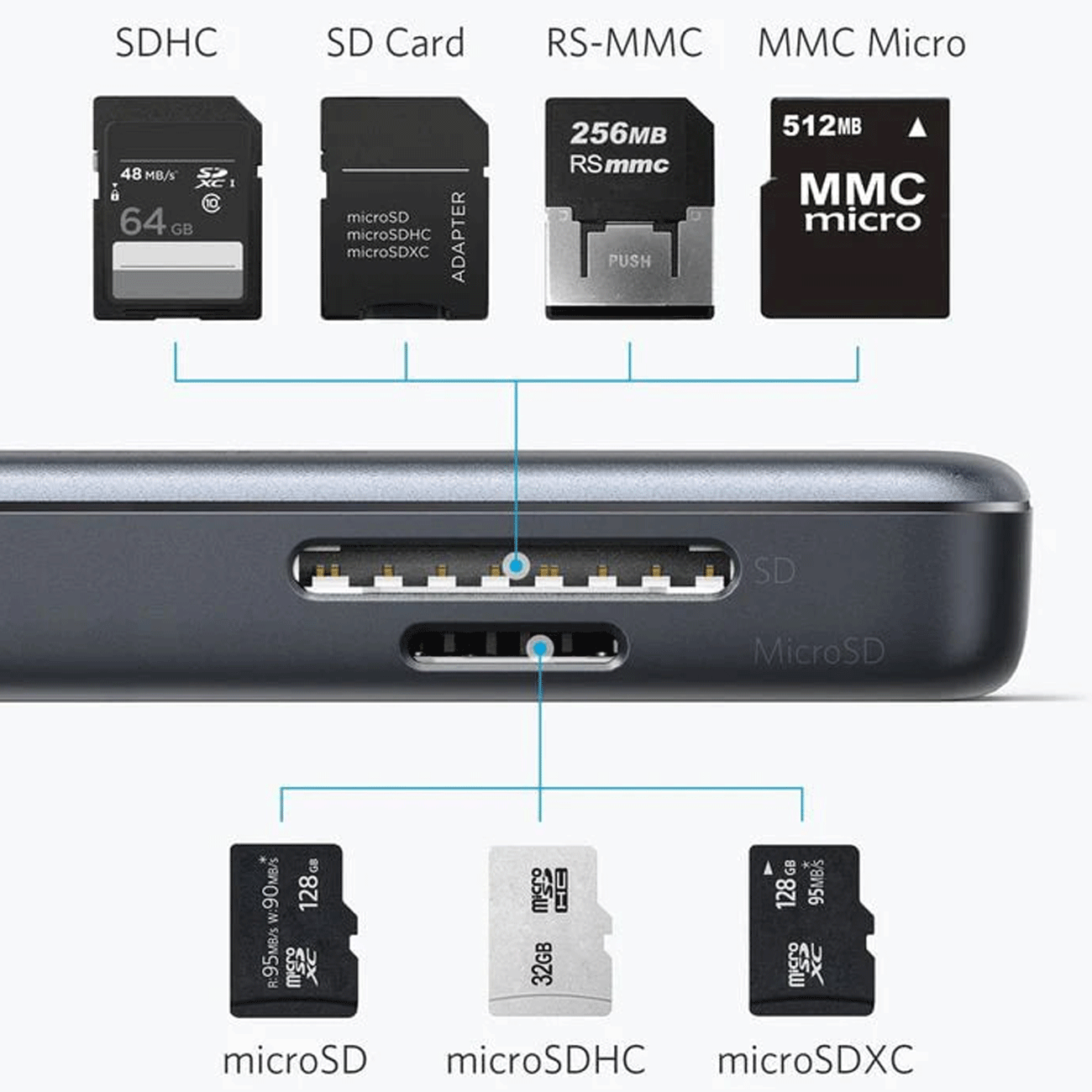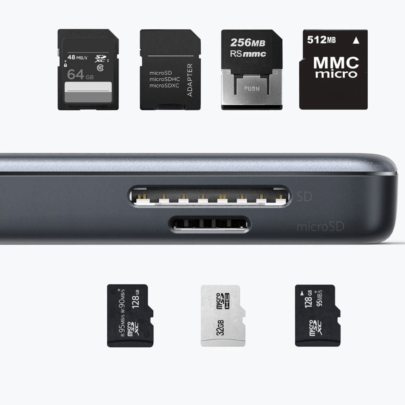 این هاب از انواع کارتهای SD، SDHC، SDXC، RS-MMC، microSD، microSDHC و microSDXC پشتیبانی میکند. سرعت خواندن و نوشتن بالا (تا 95 مگابایت بر ثانیه) باعث میشود انتقال فایل از کارتهای حافظه نیز بسیار سریع انجام شود.