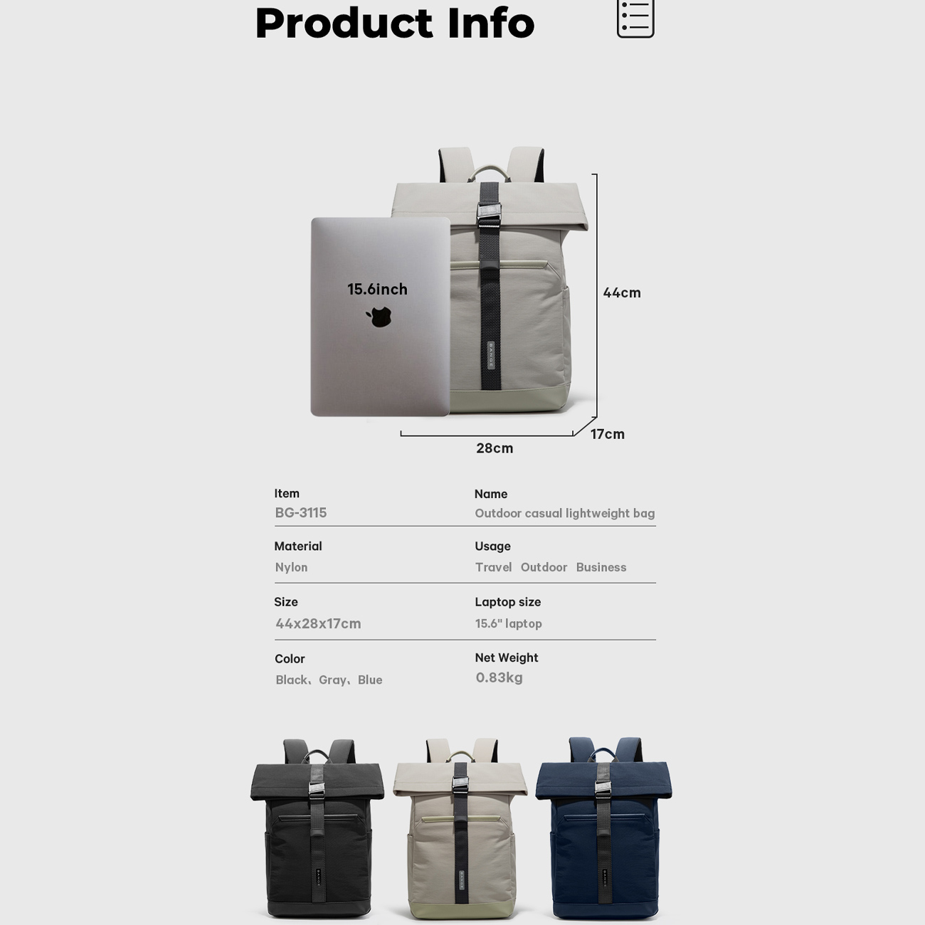 ابعاد کلی 44 × 28 × 17 سانتیمتر فضای کافی برای وسایل ضروری را فراهم میآورد بدون اینکه حمل آن سنگین یا دستوپاگیر شود. طراحی رولتاپ و جمعوجور، امکان قرارگیری در فضاهای کم را آسان میکند.3115 bange در رنگهای مشکی , طوسی و آبی عرضه شده که برای کاربردهای روزمره و رسمی مناسب هستند. زبان طراحی مینیمال و خطوط ساده به هماهنگی با سبکهای مختلف پوششی کمک میکند.بندهای شانهای قابل تنظیم با پدهای نرم، فشار را توزیع میکنند و پشتی تنفسی از تعریق جلوگیری میکند. وزن خالص 830 گرم تعادل بین استحکام و سبکی را حفظ کرده و برای استفاده روزانه مناسب است.