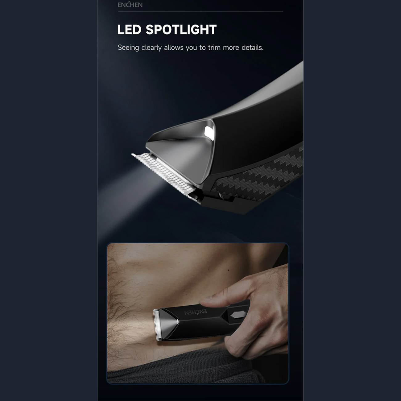 وجود چراغ LED در ماشین اصلاح Enchen Spark 2 باعث میشود حتی ریزترین موها و جزئیات بهخوبی قابل مشاهده باشند. این نور متمرکز، دید واضحتری هنگام اصلاح ایجاد میکند و دقت کار را در نواحی حساس افزایش میدهد تا اصلاحی تمیز، ایمن و بدون خطا داشته باشید.