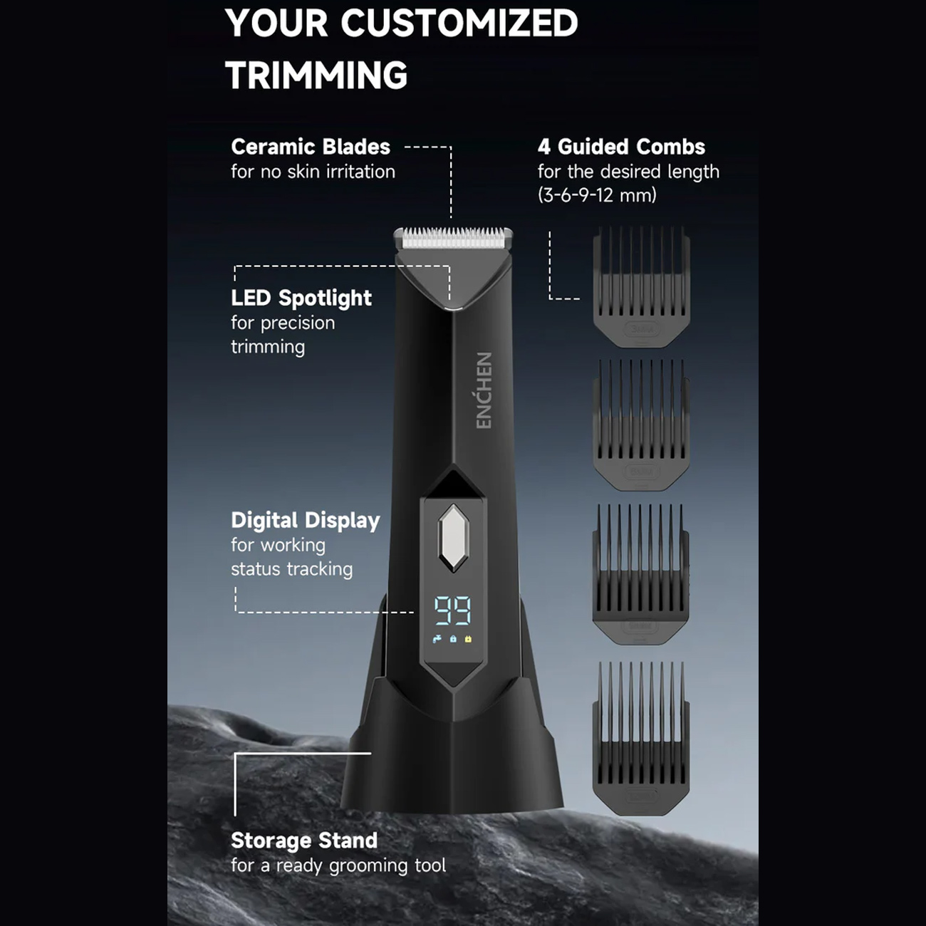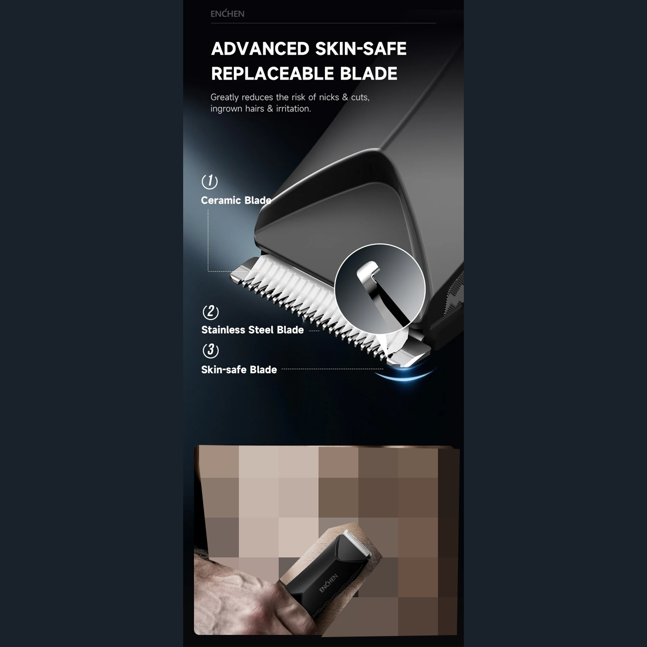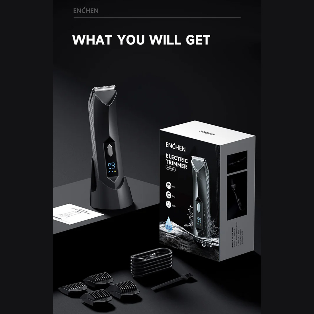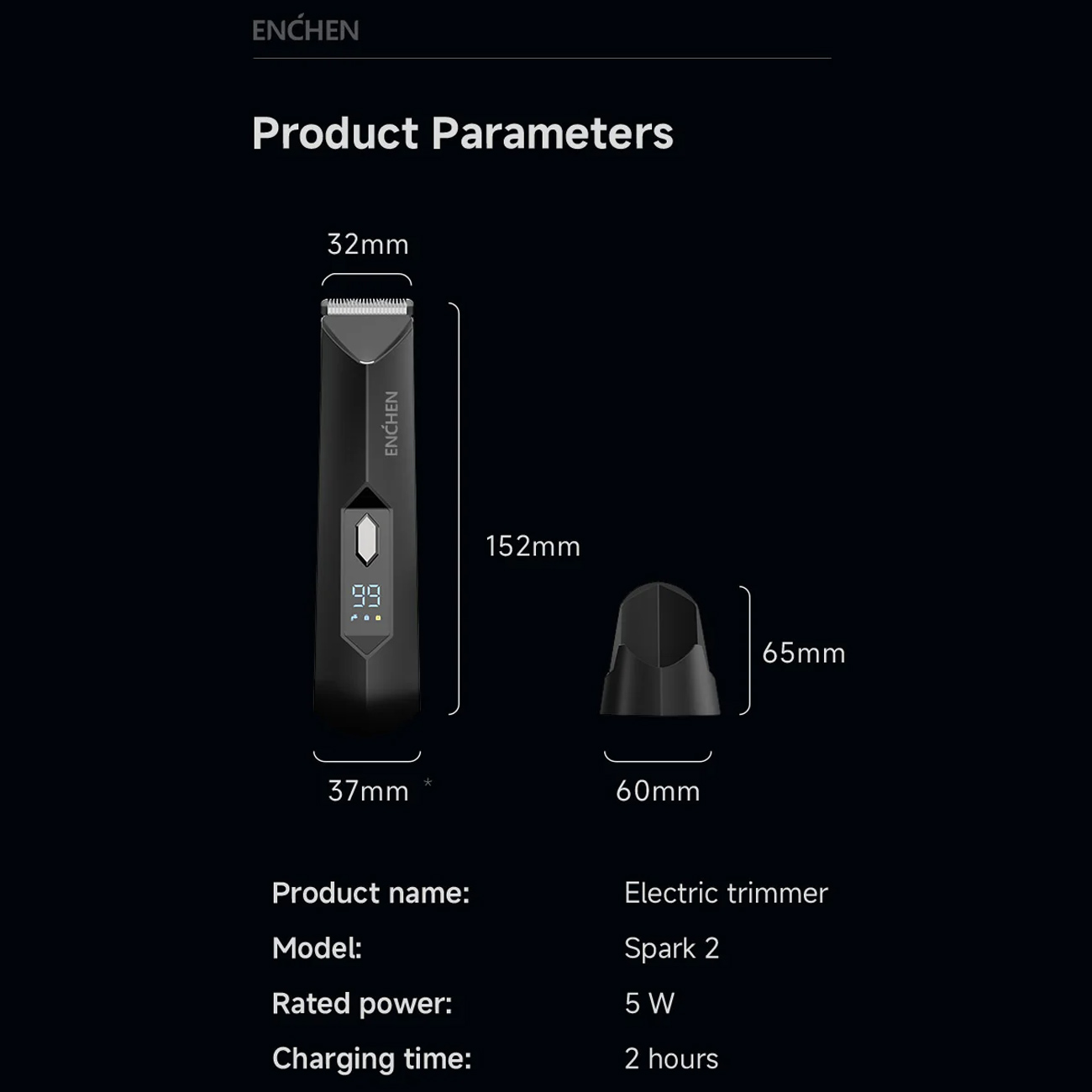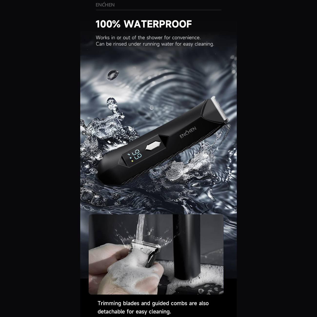 Enchen Spark 2 با طراحی کاملاً ضدآب، قابل استفاده در حمام و بهراحتی قابل شستوشو زیر آب است. تیغهها و شانههای جداشونده، نظافت سریع و حفظ بهداشت و عملکرد بهینه دستگاه را تضمین میکنند.