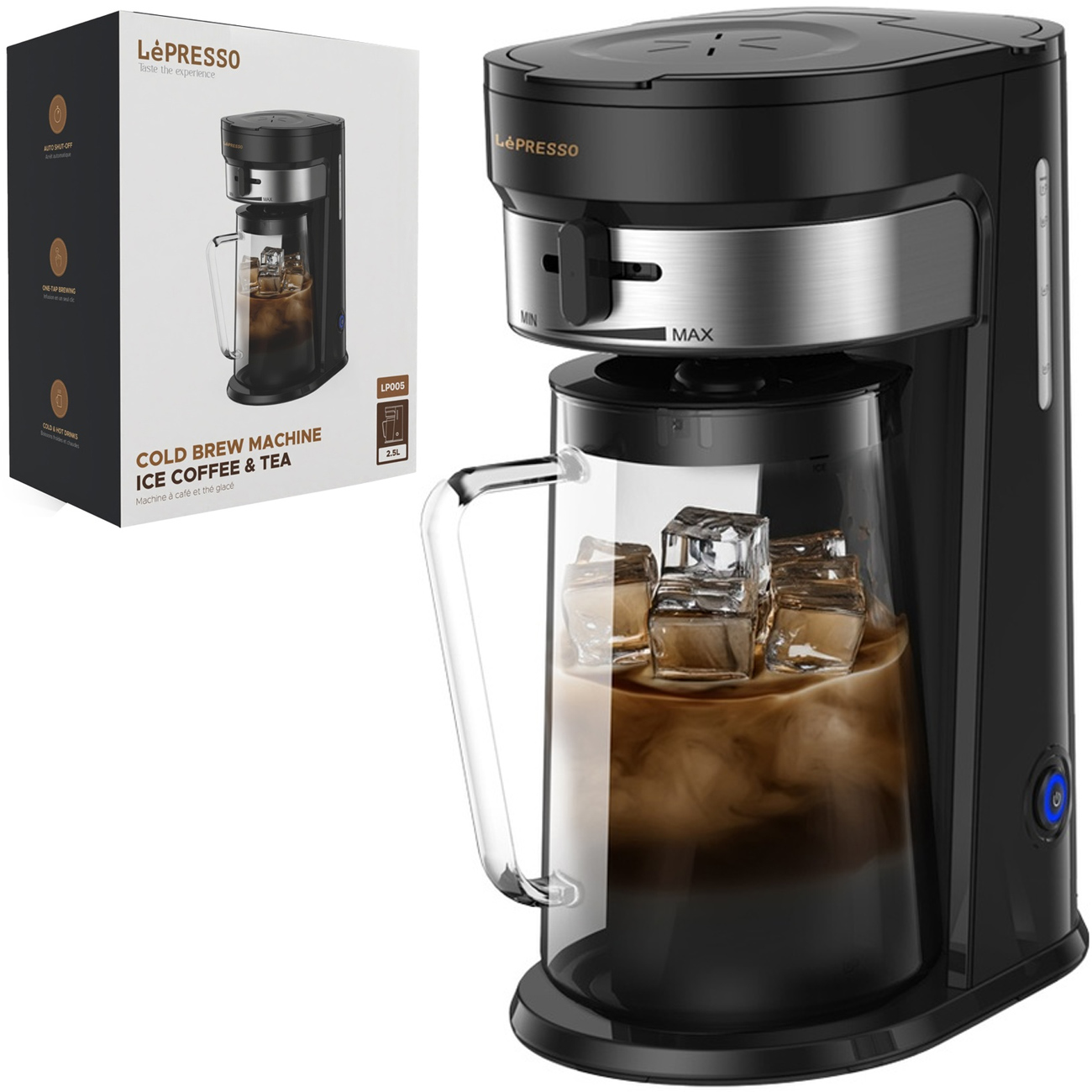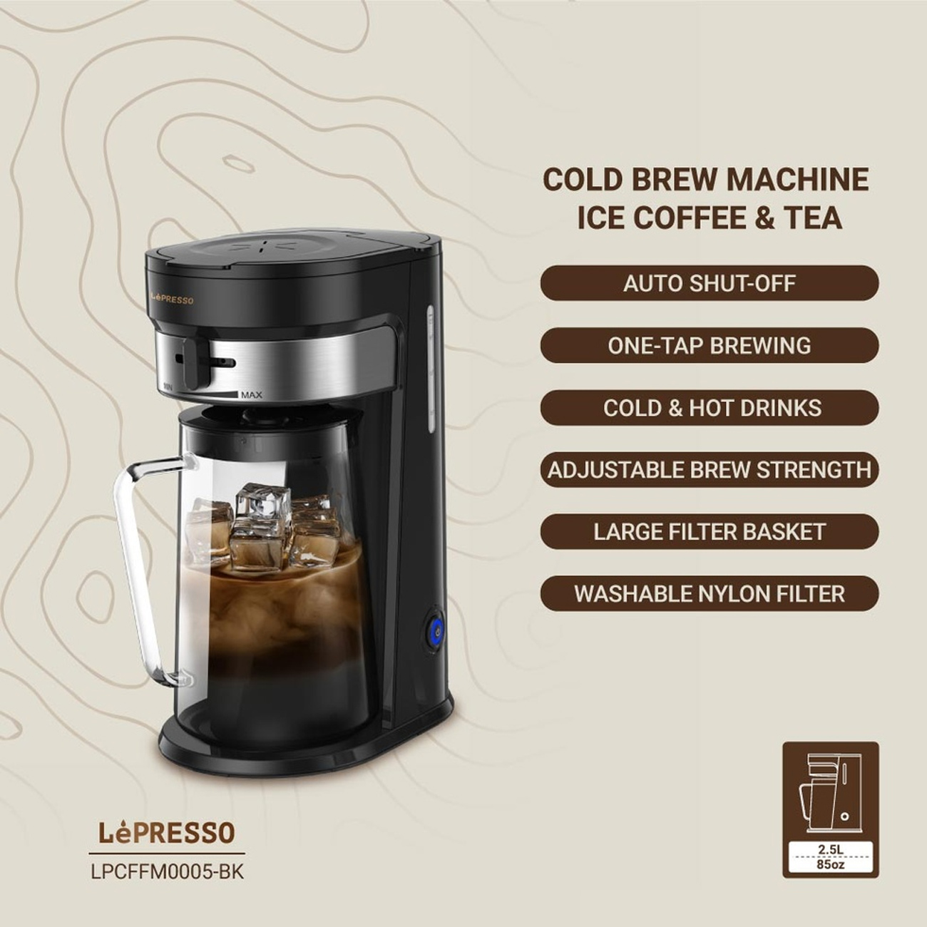 مخزن آب 0.9 لیتری و پارچ 2.5 لیتری دستگاه قهوه سرد لپرسو، امکان آمادهسازی چندین سرو همزمان را فراهم میکند. این ظرفیت مناسب، نیاز به پر کردن مکرر دستگاه را کاهش داده و کار با آن را در محیطهای خانگی و تجاری راحت میکند. همچنین حجم مناسب پارچ، برای سرو چندین فنجان قهوه یا چای در یک مرحله ایدهآل است.