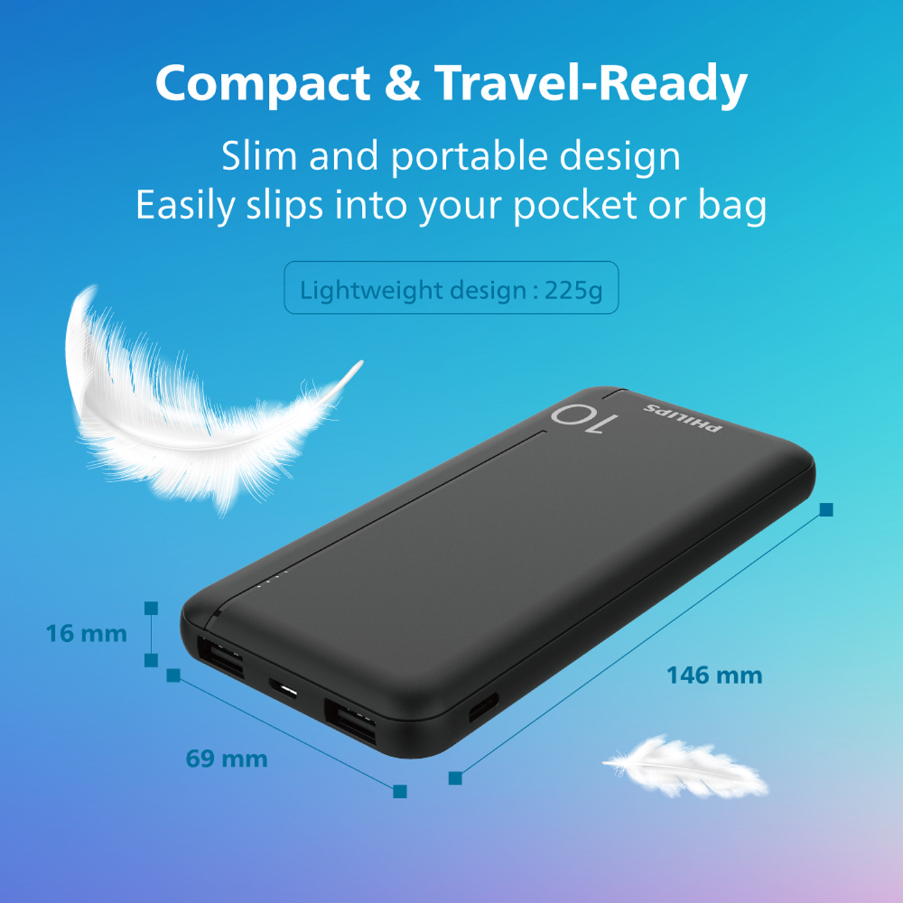 پاوربانک DLP1812PB با ضخامت تنها 9 میلیمتر و وزن 280 گرم، بهراحتی در کیف یا کوله قرار میگیرد و گزینهای عالی برای حمل روزمره به حساب میآید. طراحی باریک و سبک آن، حمل دستگاه را آسان میکند و تجربهای بدون زحمت در طول روز ارائه میدهد.