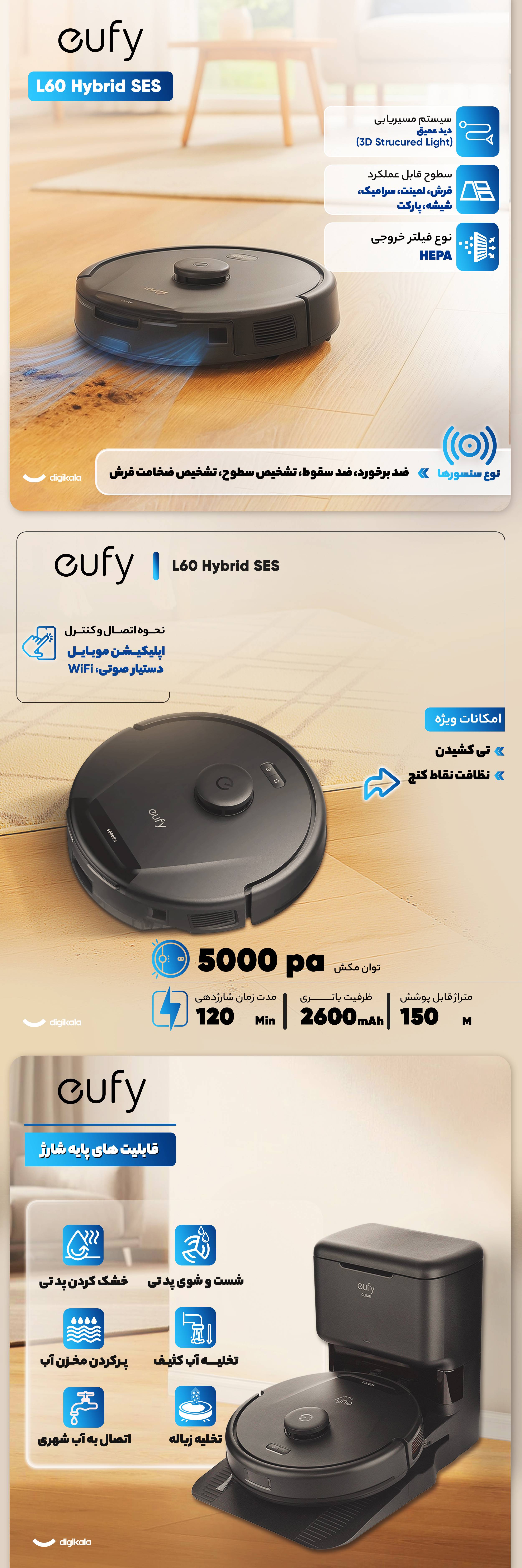 جاروبرقی رباتیک یوفی مدل L60 Hybrid SES با ابعاد ۳۲۶x۳۳۲x۱۰۲ میلیمتر و وزن ۴.۳۴ کیلوگرم، یک دستیار نظافتی هوشمند و کارآمد است. این جارو رباتیک با توان مکش قدرتمند ۵۰۰۰ پاسکال و موتور براشلس (Brushless)، به راحتی گردوغبار و زباله را از سطوح مختلفی مانند پارکت، لمینت، سرامیک و انواع فرش جمعآوری میکند. صدای عملکرد آن تنها ۵۲ دسیبل است که محیطی آرام را فراهم میآورد. باتری ۵۲۰۰ میلیآمپر ساعتی این دستگاه، امکان ۱۲۰ دقیقه کارکرد مداوم را فراهم میکند که برای نظافت مساحت ۱۰۰ مترمربع کافی است. سیستم مسیریابی لیزری (LIDAR) پیشرفته، به همراه فناوری نقشهبرداری هوشمند AI Map 2.0، به طور دقیق مسیر حرکت را مشخص کرده و از برخورد با موانع جلوگیری میکند. این جارو همچنین با سنسورهای ضدبرخورد، ضدسقوط و تشخیص ضخامت فرش، عملکردی مطمئن و هوشمندانه دارد. این جارو با قابلیتهای ویژه مانند تیکشی و جمعآوری مایعات، نظافتی جامع را ارائه میدهد. پایه شارژ آن با ابعاد ۳۶۵x۲۹۰x۳۸۰ میلیمتر، قابلیت بازگشت خودکار جارو را برای شارژ مجدد و همچنین تخلیه خودکار زباله به مخزن ۲.۵ لیتری خود فراهم میکند. کنترل این جارو رباتیک از طریق اتصال وایفای (۲.۴ و ۵ گیگاهرتز)، بلوتوث، اپلیکیشن Eufy Clean و دستیارهای صوتی Google Assistant و Amazon Alexa امکانپذیر است. این جارو دارای مخزن زباله ۰.۳۵ لیتری و مخزن آب ۰.۲۸ لیتری است.