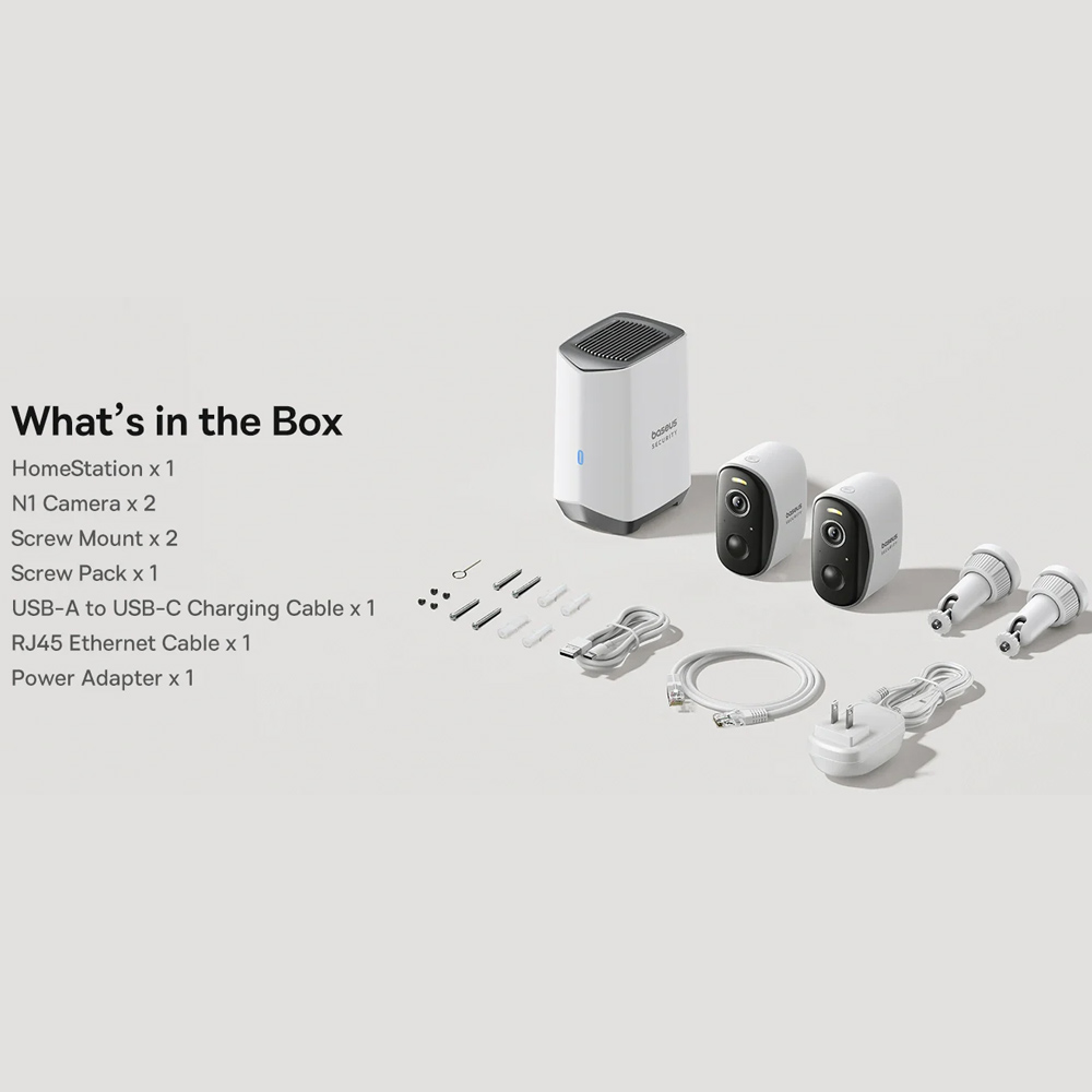 | اقلام همراه | HomeStation، دوربین N1، پایه پیچ، پک پیچ، کابل USB-A به USB-C، کابل RJ45، آداپتور برق |
