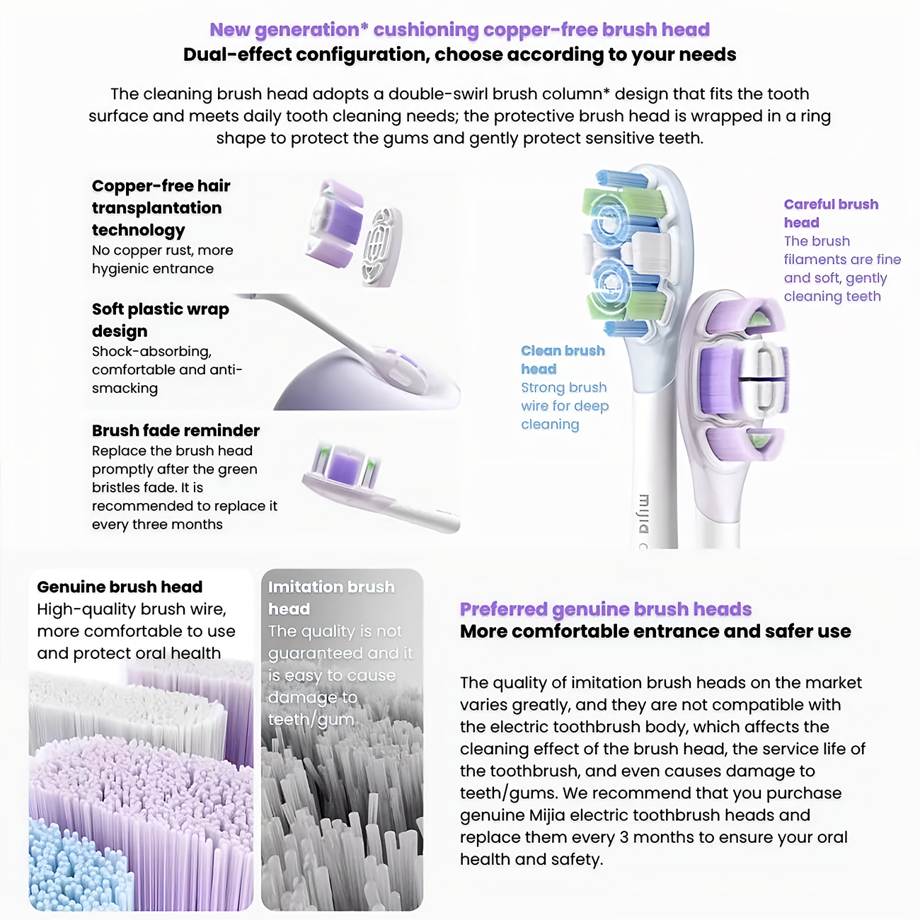 مسواک برقی سونیک شیائومی با سریهای بدون فلز (copper-free) طراحی شده است تا هیچگونه حساسیت یا زنگزدگی ایجاد نشود. دو سری مختلف (Clean و Soft) در بستهبندی موجود است که هرکدام برای نوع خاصی از دندان و لثه طراحی شدهاند. همچنین موهای برس دارای نشانگر رنگی هستند تا زمان مناسب تعویض سری را به شما یادآوری کنند. (جهت تعویض سری مسواک باید به رنگ سبز بر روی آن دقت کنید. در صورت از بین رفتن رنگ، سری مسواک را باید تعویض کنید.)