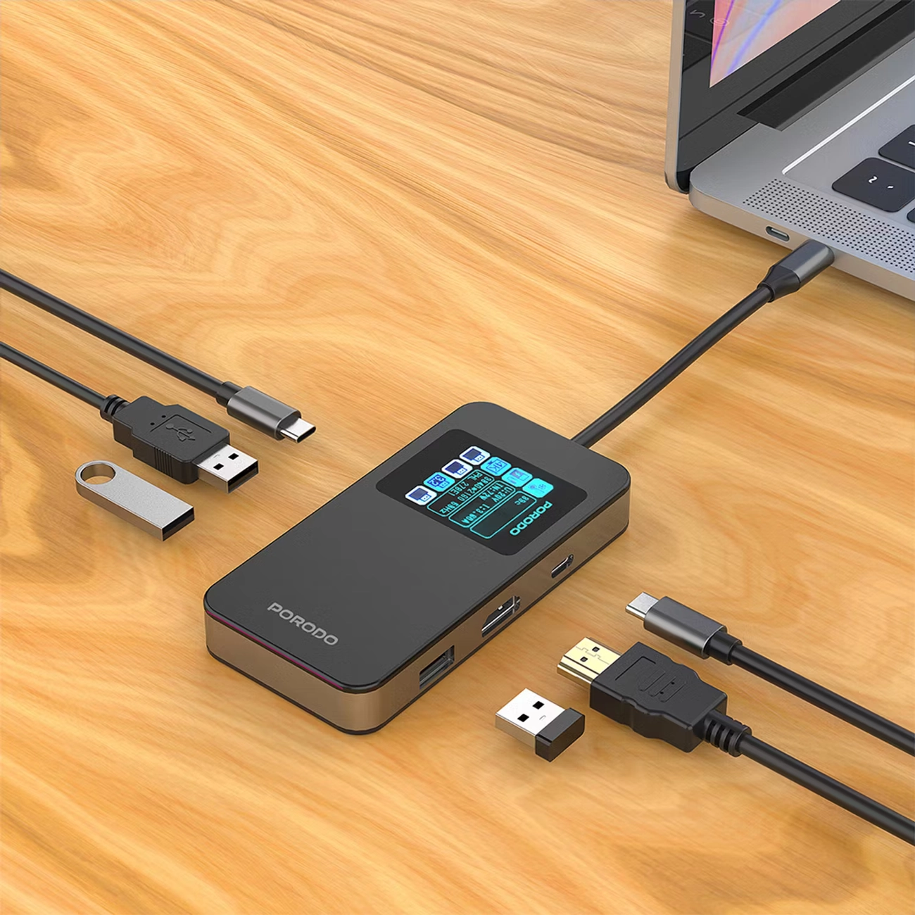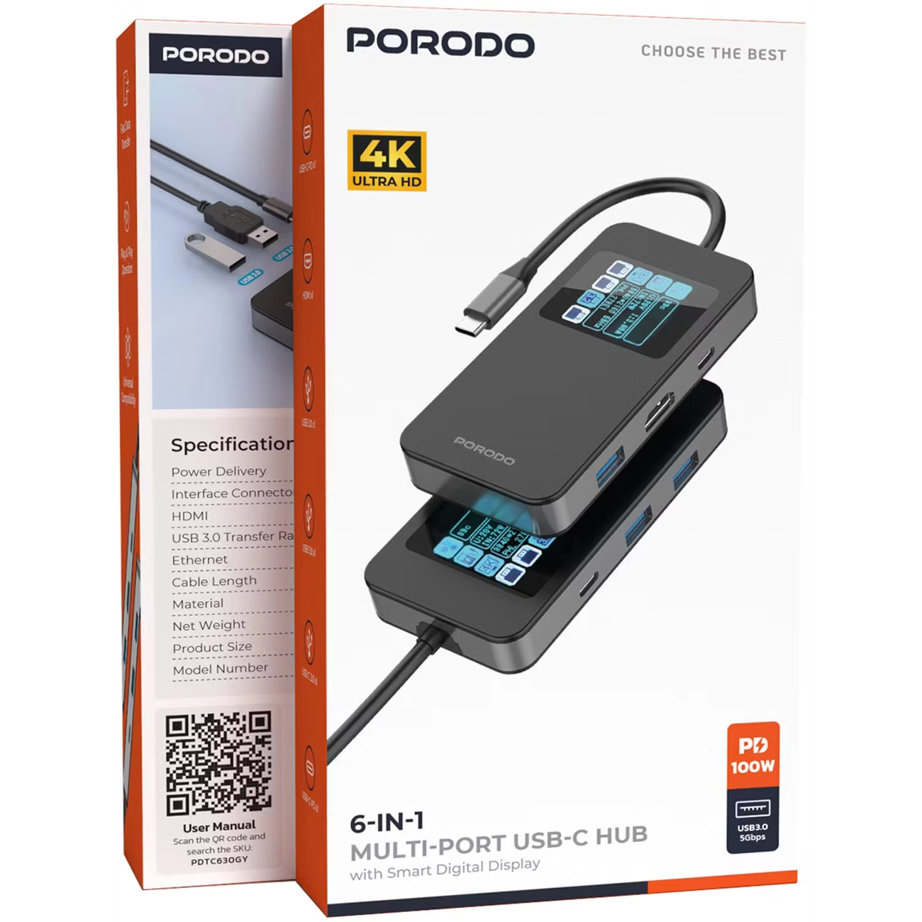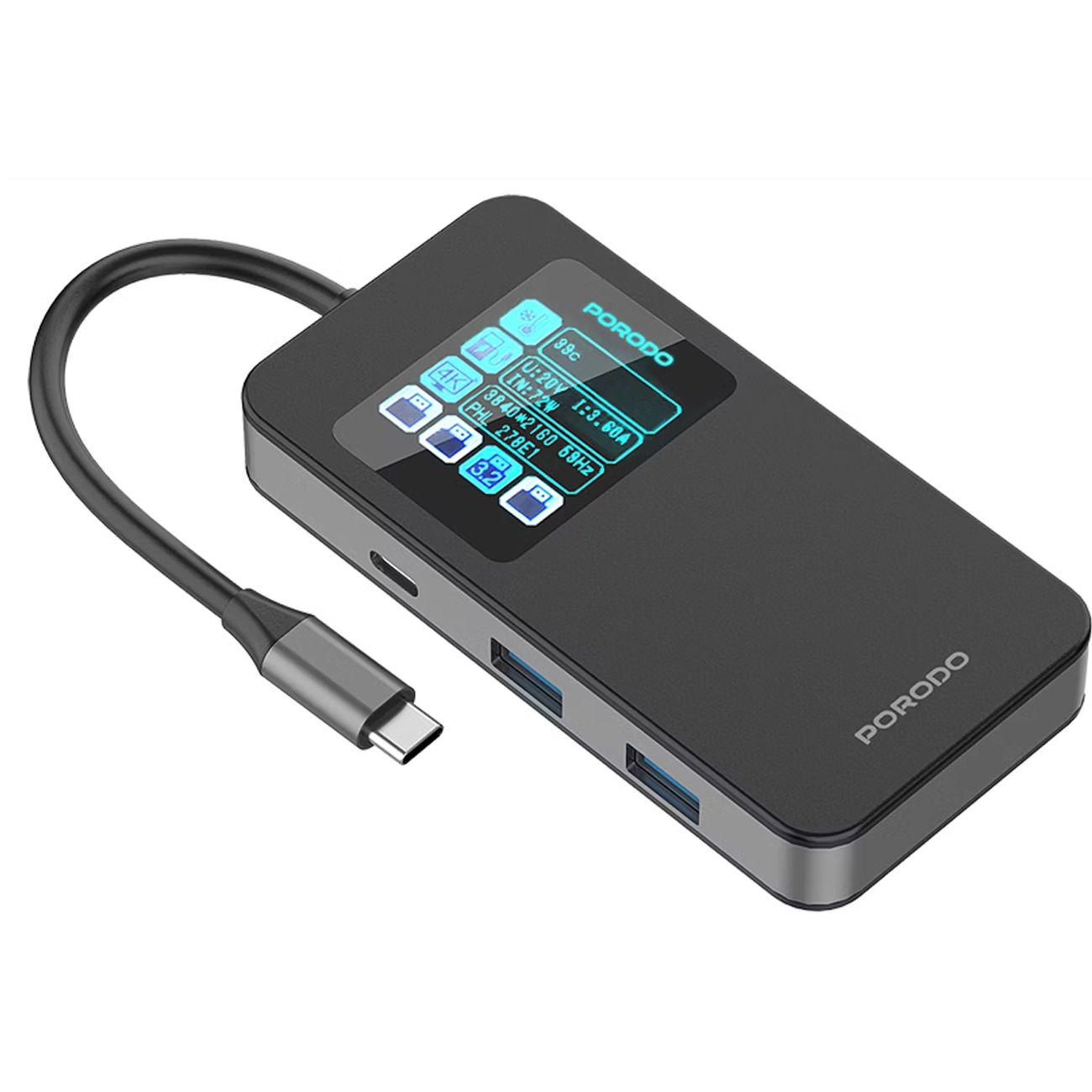 هاب تایپ سی 6 پورت پورودو Porodo مدل PDTC630GY با نمایشگر دیجیتالی
