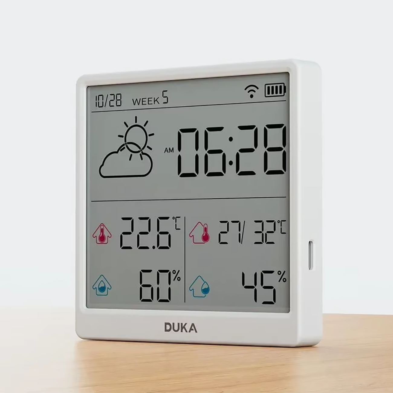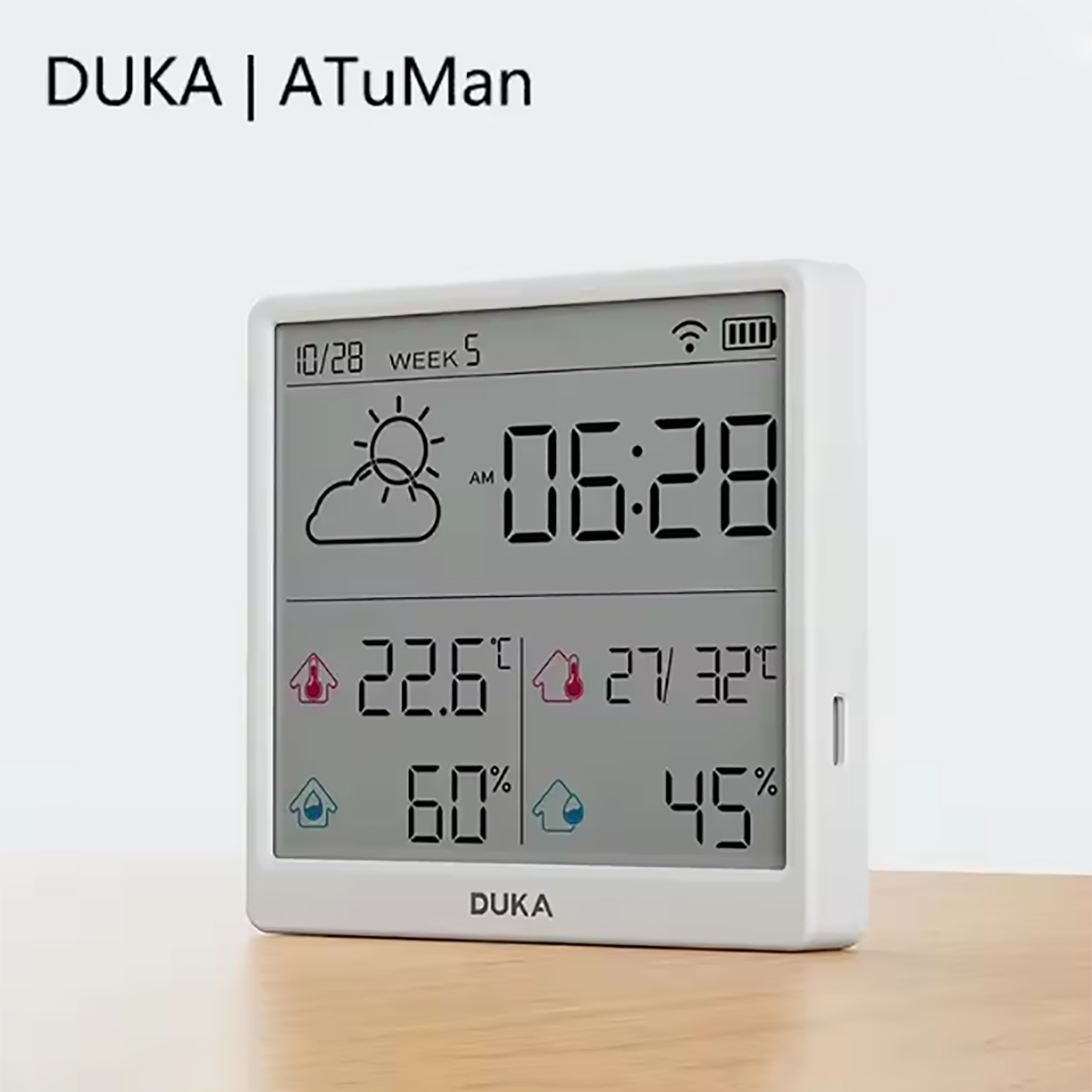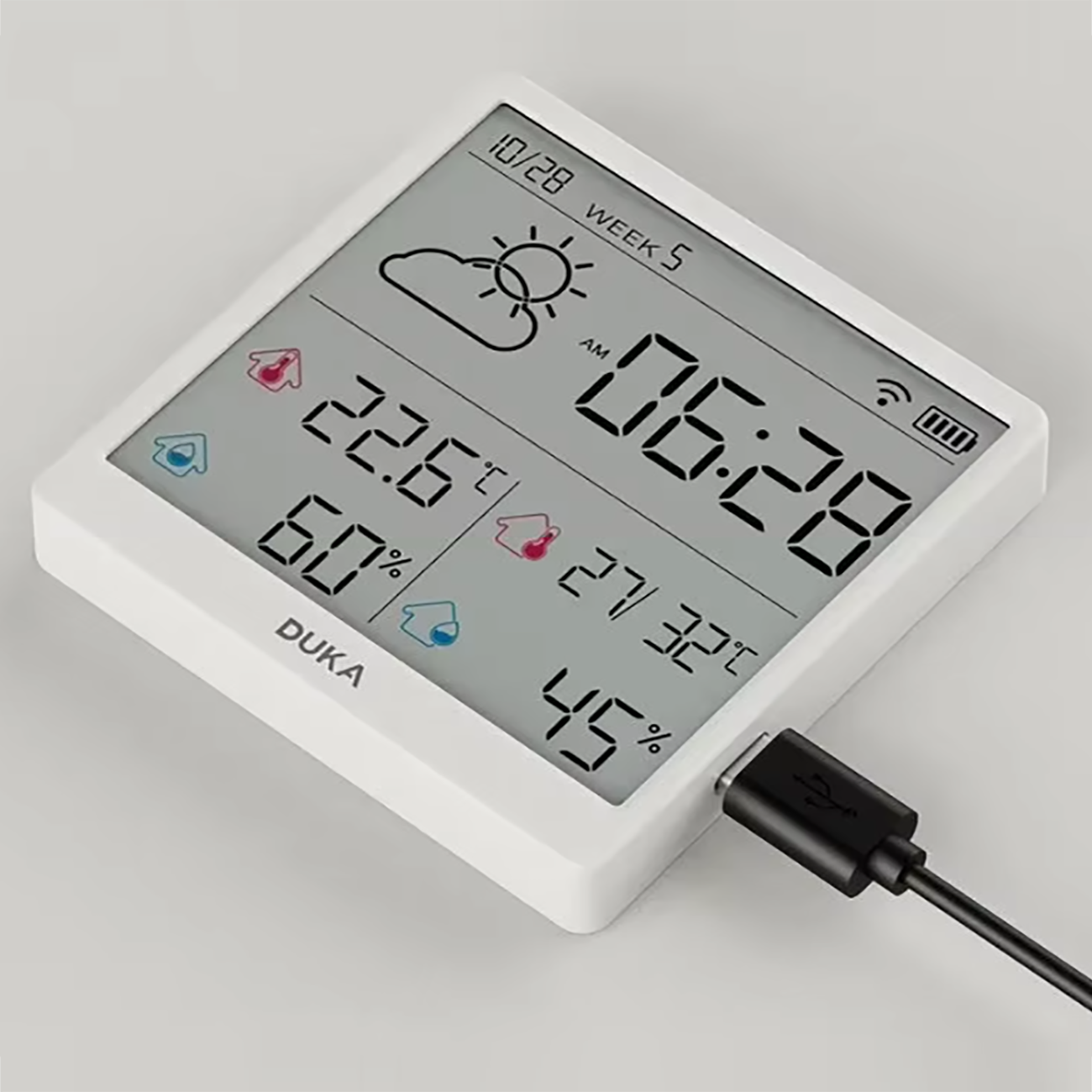 | زمان کالیبراسیون خودکار بدون نیاز به تنظیمات دستی | همگام سازی خودکارساعت، تاریخ، هفته و .. پس از اتصال دماسنج و رطوبت سنج به اینترنت |