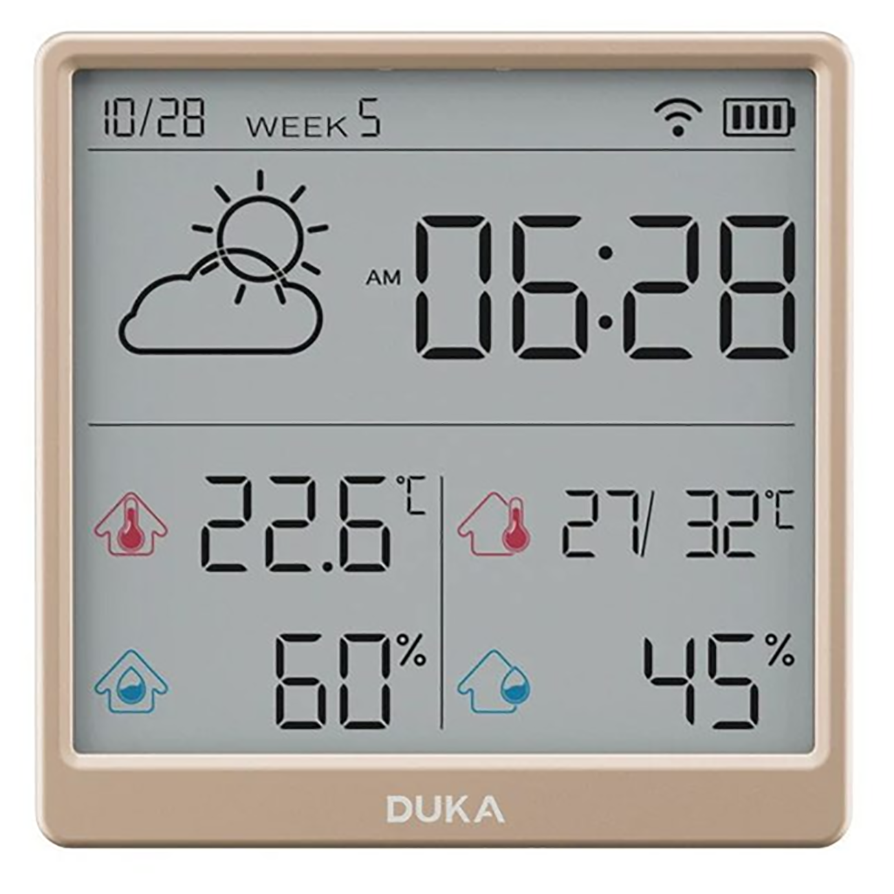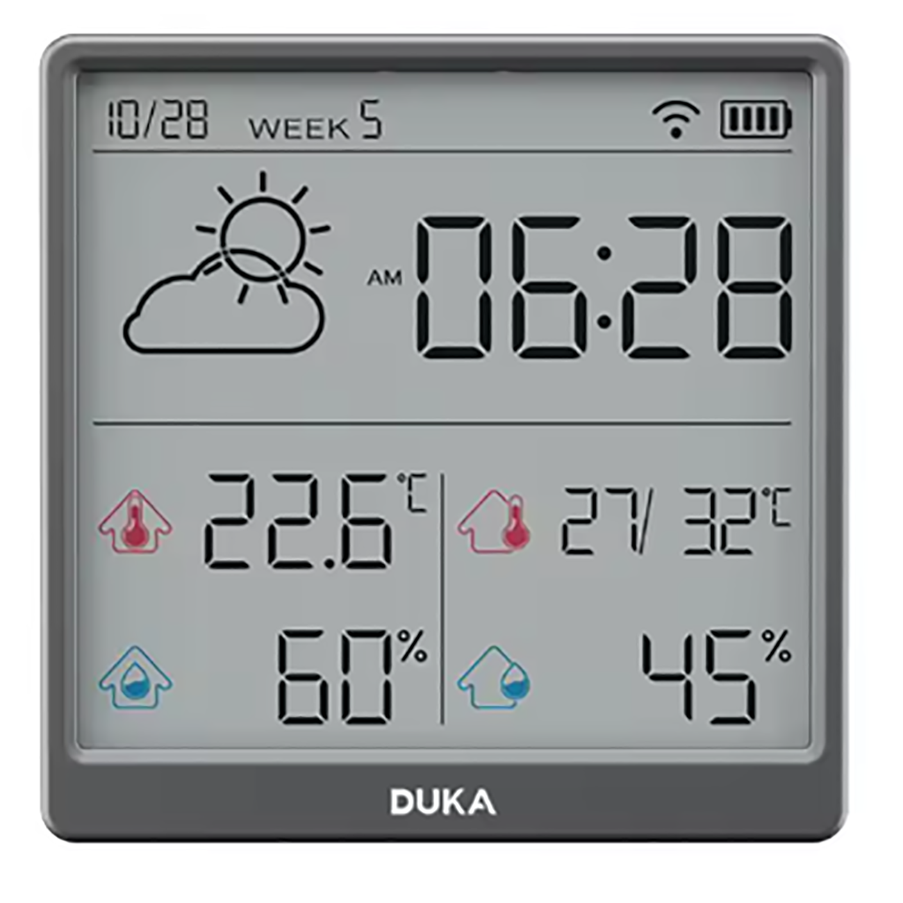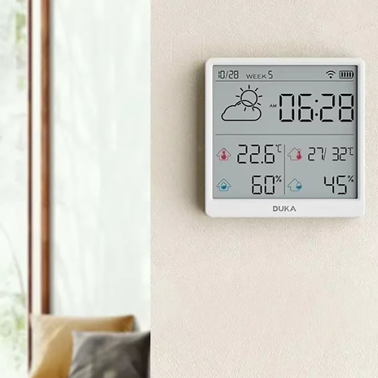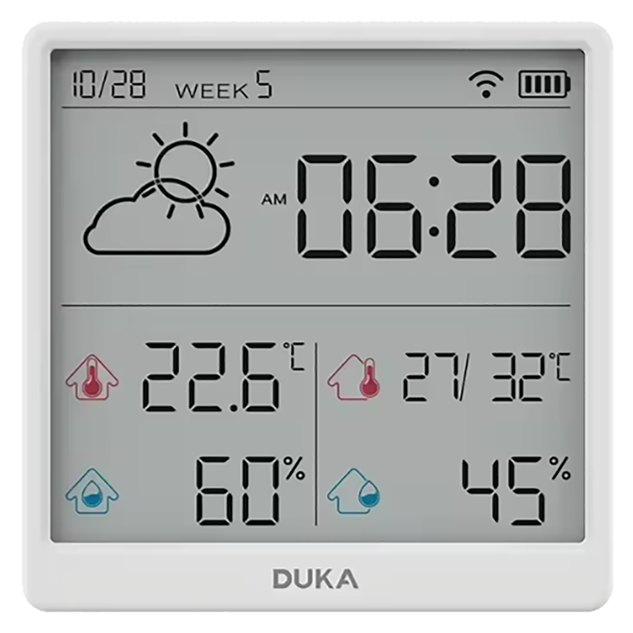 | زمان کالیبراسیون خودکار بدون نیاز به تنظیمات دستی | همگام سازی خودکارساعت، تاریخ، هفته و .. پس از اتصال دماسنج و رطوبت سنج به اینترنت |