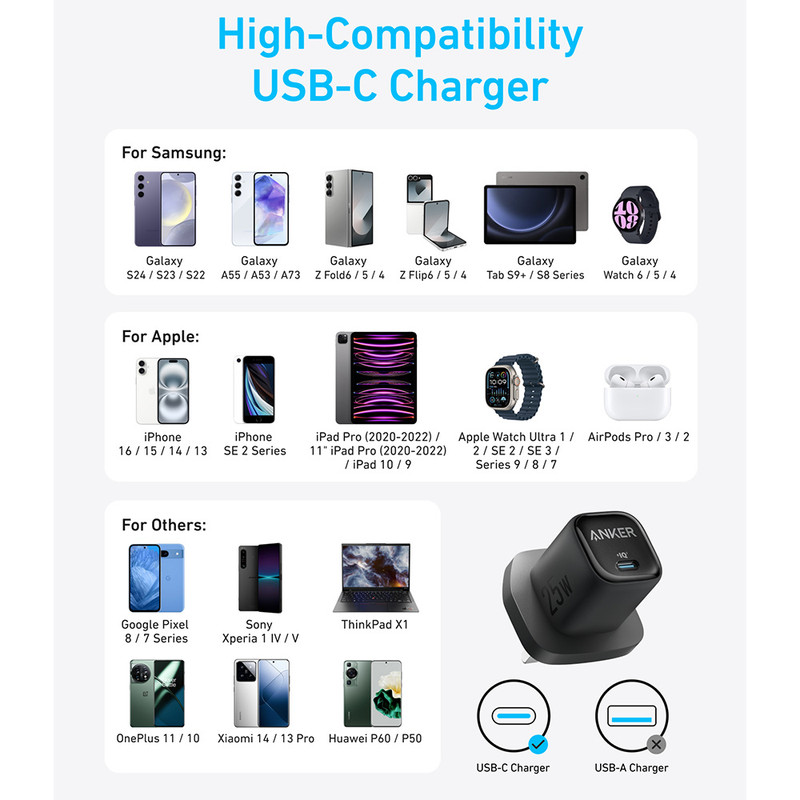 شارژر دیواری 25W انکر A2656 برای شارژ طیف وسیعی از دستگاهها مناسب است: