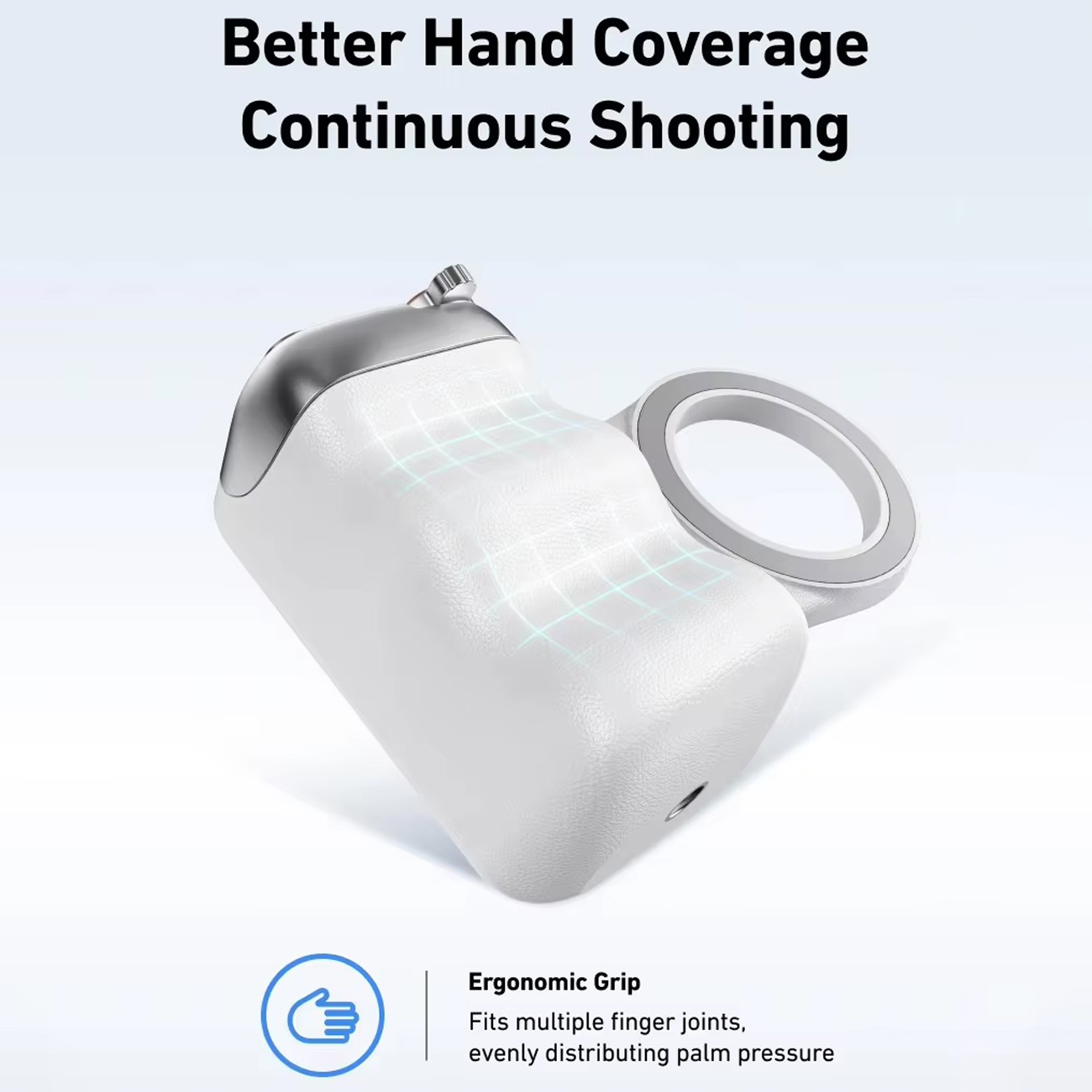 فرم انحنادار دسته هولدر دوربین موبایل TELESINبا شعاع تقریبی 45 میلی متر بر اساس اصول ارگونومی طراحی شده تا فشار کف دست بهصورت یکنواخت توزیع شود. این طراحی باعث میشود در عکاسی طولانیمدت، خستگی کمتری احساس شود و کنترل بهتری روی کادر وجود داشته باشد. پوشش سیلیکونی ضدلغزش نیز مانع سر خوردن دست میشود و حس یک دوربین کامپکت واقعی را منتقل میکند.