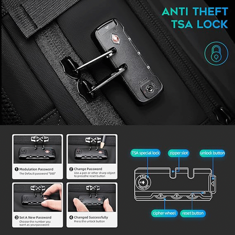 کیف کوله Bange با قرار دادن یک قفل ضد سرقت TSA از هرگونه سرقت وسیله هایتان جلوگیری کرده است؛ این قفل در قسمت کناری زیپ اصلی قرار داده شده است تا امنیت کیف را چند برابر کند.